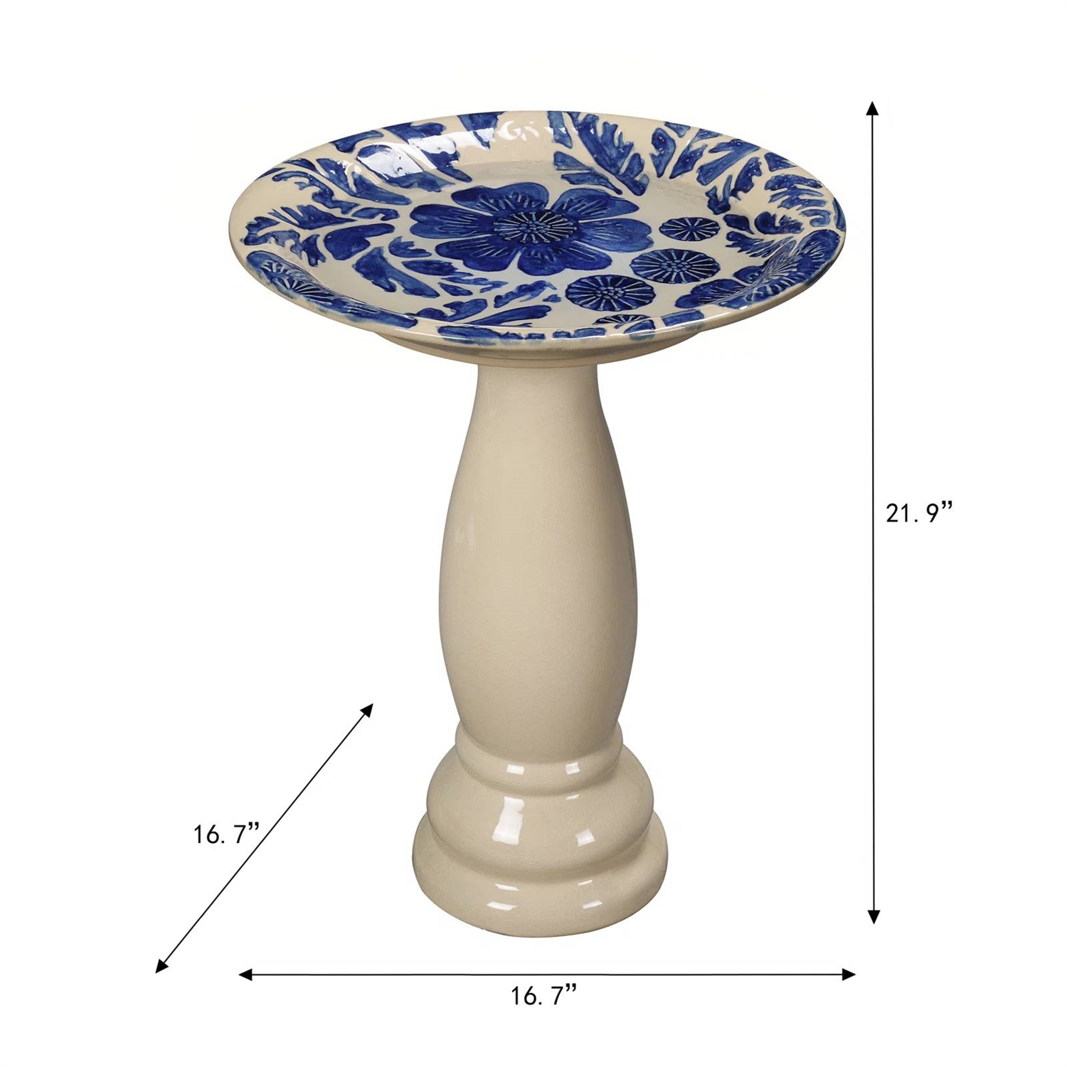 This Ivory Cream Blue Glazed Ceramic Outdoor Garden Patio Birdbath is the perfect hang-out for your feathered friends. With your choice of two floral finishes, this birdbath makes the perfect accent in your backyard garden. A cream-colored glazed ceramic pedestal holds a basin with a blue flower-patterned interior, creating the perfect cottage chic accent. The teal option has a dynamic dark burnished brown glaze dripping down the teal pedestal to add a dark accent to the boho coastal look. With the shallow floral basin holding just a little over half a gallon of water, your little birdy companions have the perfect amount of water to drink and bathe in.